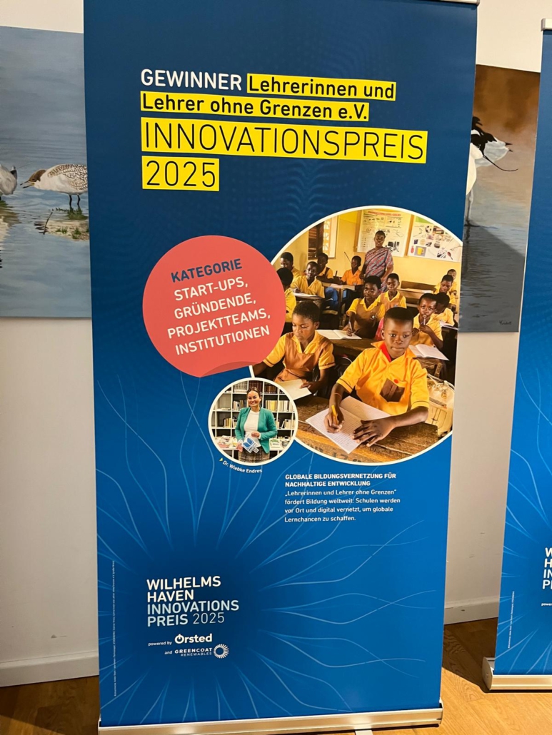 Das Engagement unseres Vereins für weltweite Bildung wurde mit dem Wilhelmshavener Innovationspreis ausgezeichnet. „Lehrerinnen und Lehrer ohne Grenzen e.V.“ gewann in der Kategorie „Startups, Gründende, Projektteams und Institutionen“. Unsere 1. Vorsitzende, Dr. Wiebke Endres, nahm den mit 5.000 Euro dotierten Preis vom Wilhelmshavener Oberbürgermeister, Carsten Feist, mit großer Freude und Dankbarkeit entgegen: „Mir persönlich bedeutet dieser Preis sehr viel bedeutet, da der Verein in Wilhelmshaven gegründet wurde, meiner Heimat. Wilhelmshaven steht wie kaum eine andere Stadt als Hafenstadt für Weltoffenheit, die zugleich immer wieder vor großen Herausforderungen gestellt wird und sich immer wieder neu erfinden muss. Genau das passt so gut zu unserem Verein. Wir freuen uns riesig über den Preis, da wir uns dadurch noch mehr Sichtbarkeit erhoffen, um das globale Netzwerk zur Förderung von Bildung für 245 Millionen Kinder und Jugendliche schnellstmöglich Wirklichkeit werden zu lassen.“